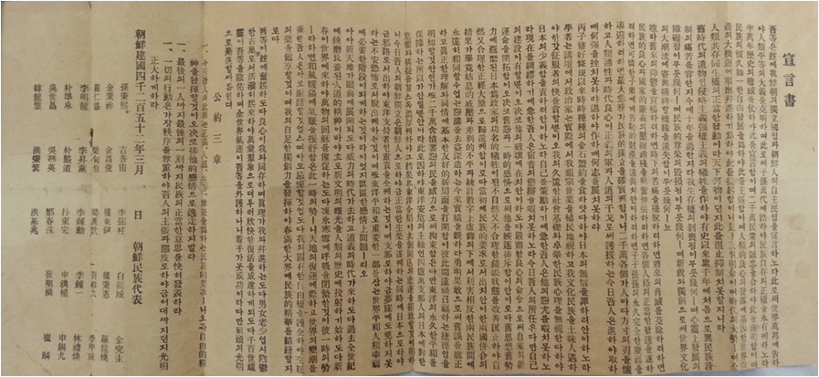 우리는 오늘 조선이 독립한 나라이며, 조선인이 이 나라의 주인임을 선언한다. 우리는 이를 세계 모든 나라에 알려 인류가 모두 평등하다는 큰 뜻을 분명히 하고, 우리 후손이 민족 스스로 살아갈 정당한 권리를 영원히 누리게 할 것이다.