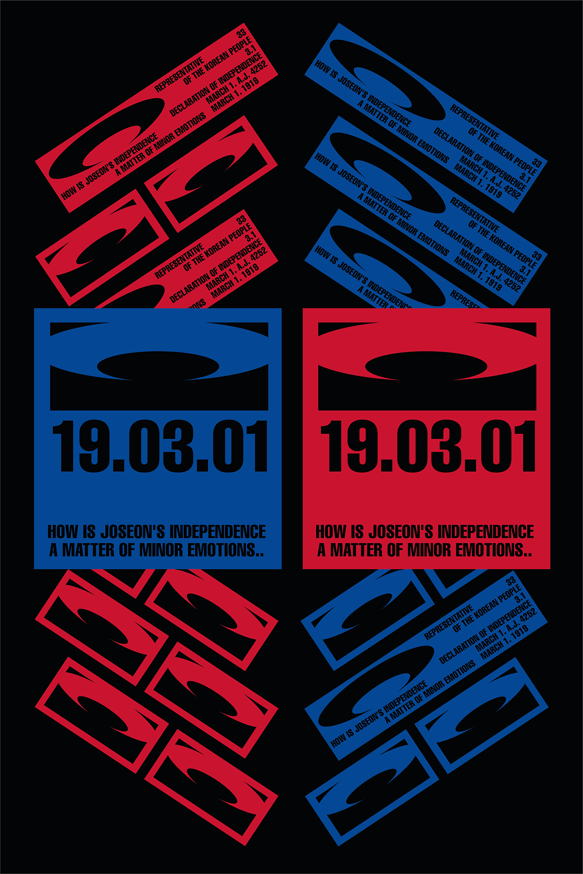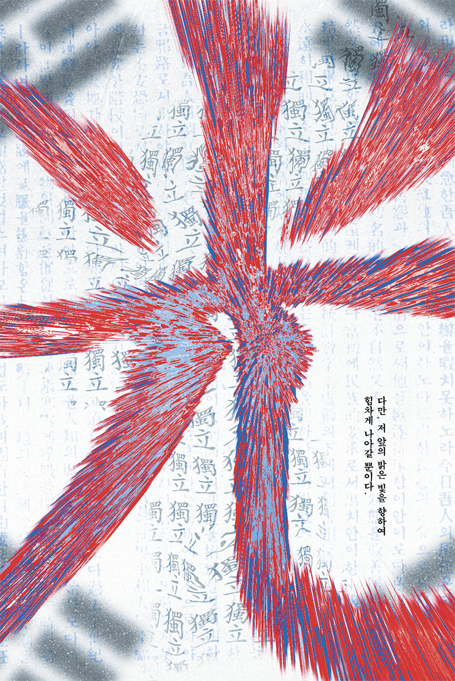 제가 받은 주제는 독립선언문의 마지막 부분에 해당합니다. 그만큼 당시 그들이 느꼈던 사무침, 처절함, 원통함, 후련함과 같은 복합적인 감정이 다른 부분보다 더욱 강하게 다가왔습니다. 이러한 감정을 담아내기 위해, 비교적 화려하고 많은 요소를 포함한 그래픽을 제작했습니다.