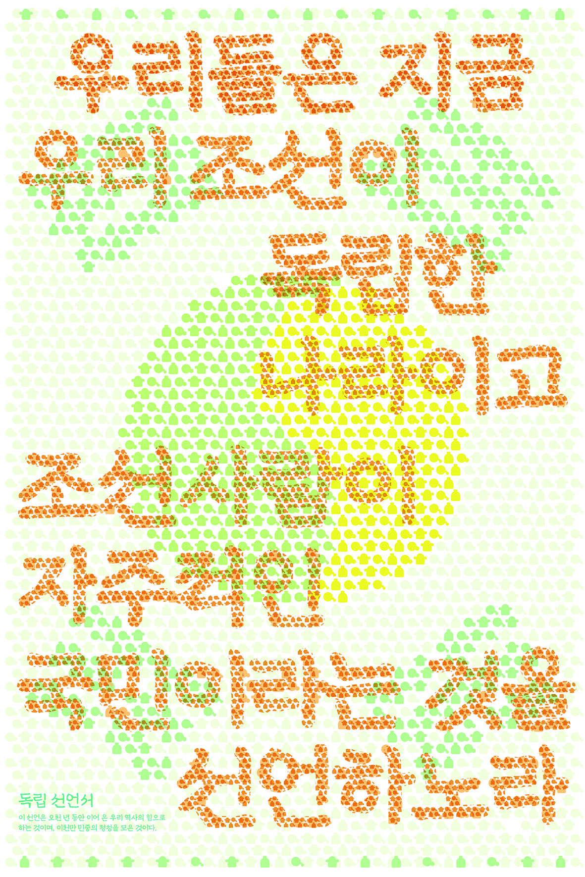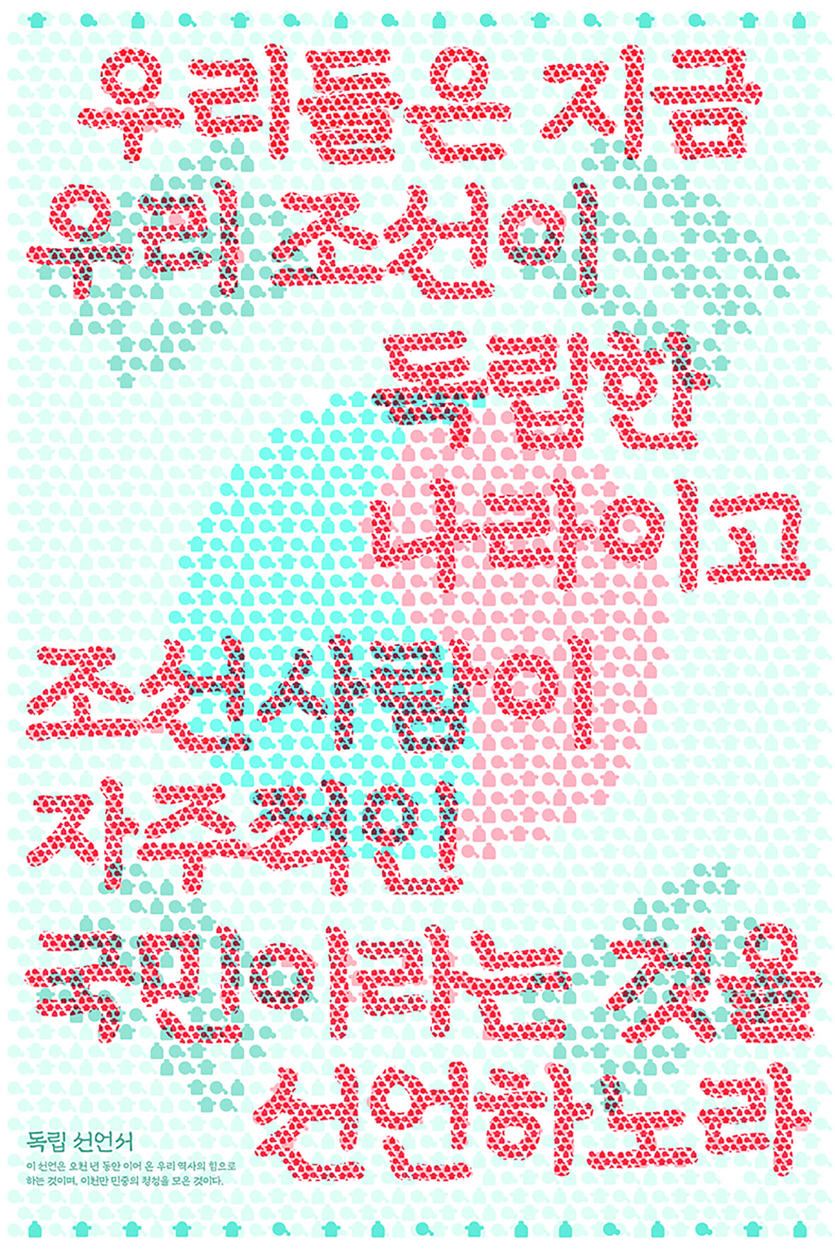 이에 따라 여성, 남성, 학생, 농민을 표현한 기본 그래픽 요소를 제작하고, 점묘법을 활용해 독립선언서의 첫 문장과 태극기 형상을 중첩한 이미지를 구성하였습니다. 또한, 포스터 상하단에는 33개의 인물 아이콘을 배치해 독립선언서를 작성한 민족대표 33인을 상징화했습니다.