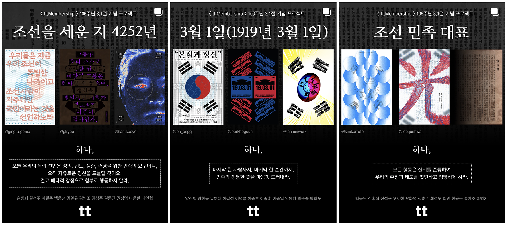 티티서울은 주니어 디자이너들과 함께 독립선언서를 현대적인 시각으로 재해석하는 작업을 진행했다. 선언서의 문구와 그날의 외침을 시각적 언어로 풀어내며, 잊혀가는 역사적 의미를 다시금 조명했다.