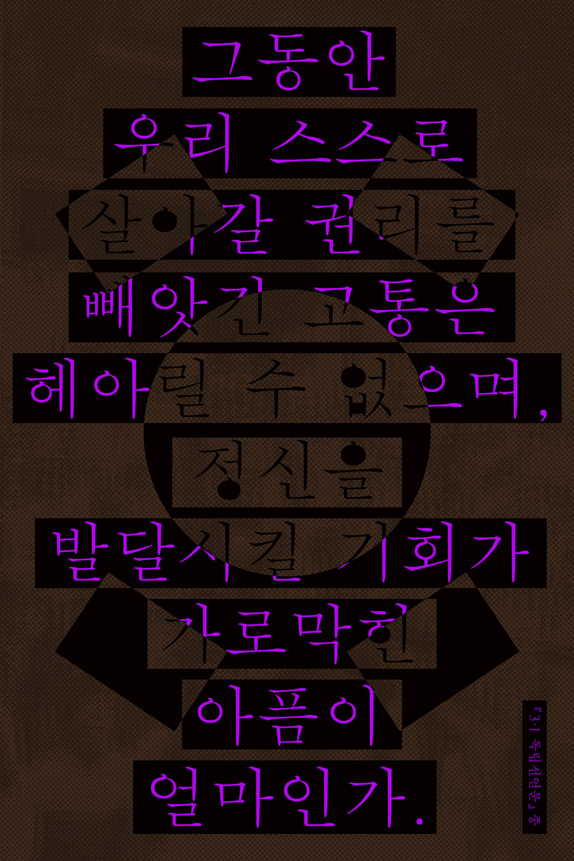 2. 그동안 우리 스스로 살아갈 권리를 빼앗긴 고통은 헤어릴 수 없으며, 정신을 발달시킬 기회가 가로막힌 아픔이 얼마인가. 것을 선언하노라.