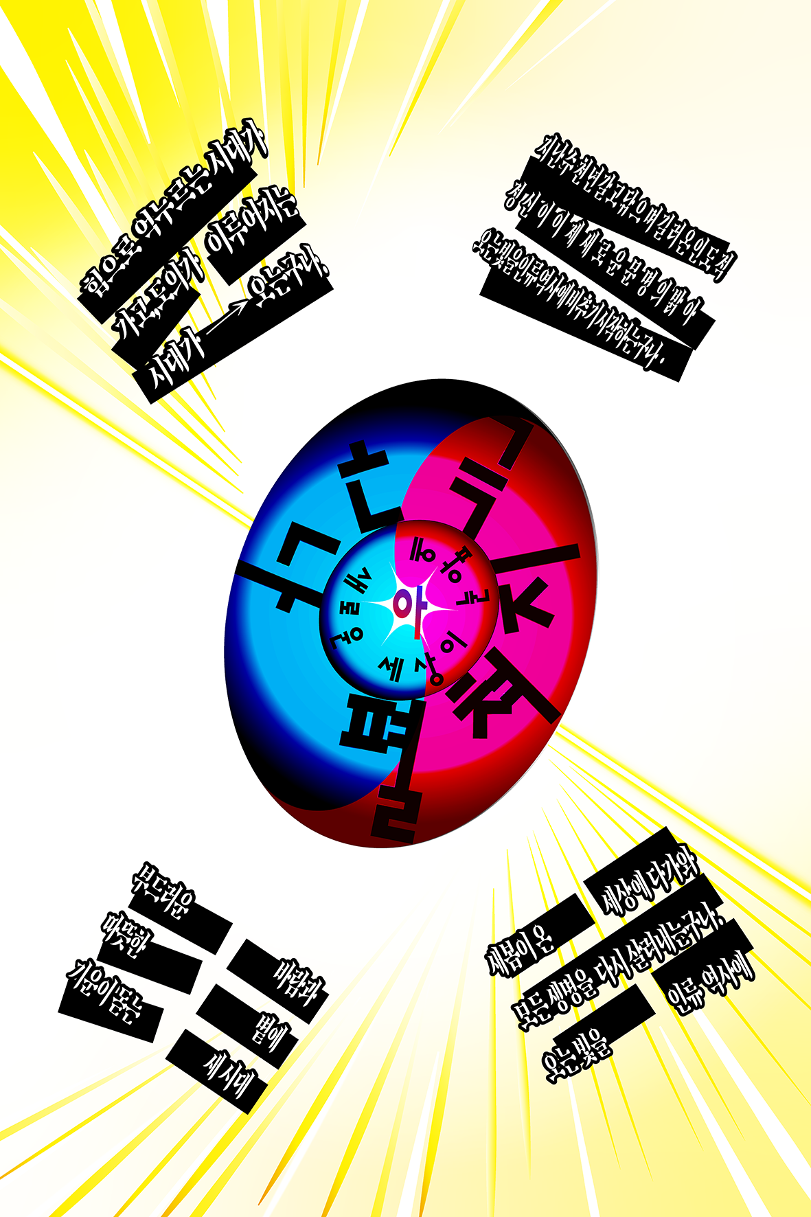 아름답고 찬란한 태극기의 모습을 표현하고 싶었습니다. 기존의 틀을 벗어나면서도 태극기의 본래 색상을 유지하며, 형태에 변화를 주는 디자인을 시도했습니다.