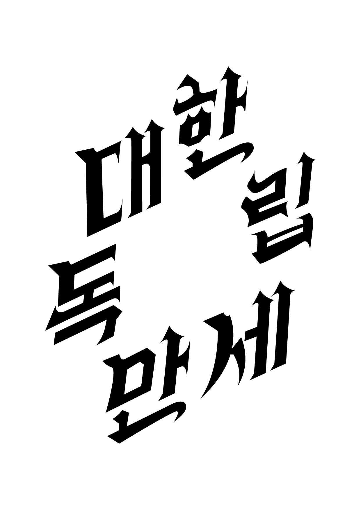특히 한글에서는 홀자의 보 / 첫닿자의 내림 등에서 획이 직선으로 뻗어있고, 받침닿자가 홀자와 연결되는 특징을 볼 수 있는데, 이처럼 얇은 선에서 담담히 묻어나오는 결연함과 투쟁의지를 담아내고자 하였다.