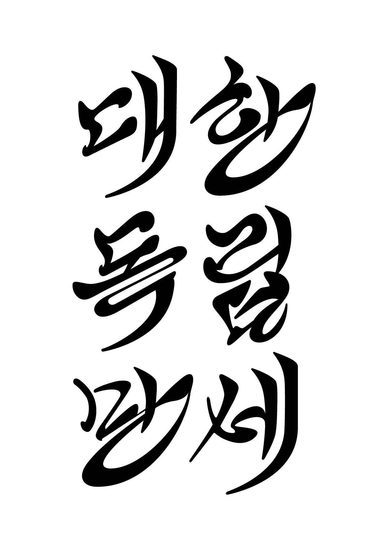 판각화처럼 패임이 드러나는 투박한 형태는 나라와 민족이 겪어온 아픔과 고통을 표현하고, 반흘림체를 참고해 연결된 필획은 ‘나로부터 시작되고 나로부터 끝난다’는 이치를 통해 민족의 연대를 상징한다.
