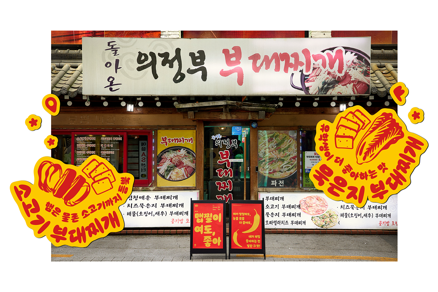 한국인에게 국물이 갖는 의미는 무엇일까요? 신촌랩소디 상권에는 답답한 가슴을 뻥 뚫어주는 국물 맛집이 두 군데나 있습니다. <돌아온 의정부 부대찌개>는 신촌 인근의 학생들은 물론 유학생에게도 사랑받는 ‘찐’ 부대찌개 맛집입니다. 고기와 햄이 아낌없이 들어간 소고기 부대찌개와 시원한 국물 맛을 자랑하는 묵은지 부대찌개가 인기 메뉴인데요. 소고기와 묵은지의 조합이라니 벌써부터 침이 꼴깍 넘어갑니다. 특유의 시원한 국물이 MSG 대신 진심과 정성을 푹 끓여낸 결과물이라는 사실 역시 놀랍기만 한데요. 끓일수록 깊어지는 국물 맛은 물론이고 정겨운 가게 분위기, 한결같은 사장님의 인자함까지. <돌아온 의정부 부대찌개>의 넘치는 매력들이 오늘도 기꺼이 부대찌개 한 그릇을 먹어야 할 이유가 되어줍니다.