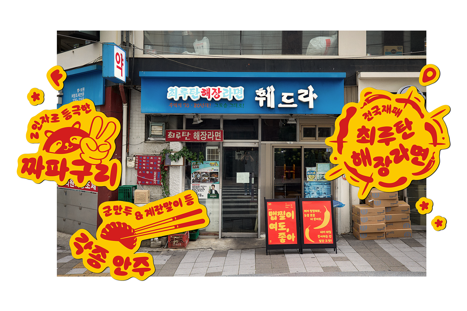 다음으로 <훼드라>는 최루탄 해장라면으로 유명한 신촌의 대표 노포입니다. 최루탄 해장라면은 진한 육수를 베이스로 콩나물과 바지락까지 챙겨 넣은 칼칼한 라면인데요. 몇 해 전 편의점에서 기획 상품으로 출시될 만큼 유명한 메뉴랍니다. 단, 위장이 약하다면 속이 쓰릴 수 있으니 맵기 조절은 필수! 해장하고 가려다가 눌러앉아 한 잔 더 하게 만든다는 마성의 메뉴와 함께 올여름 이열치열을 실천해보세요!