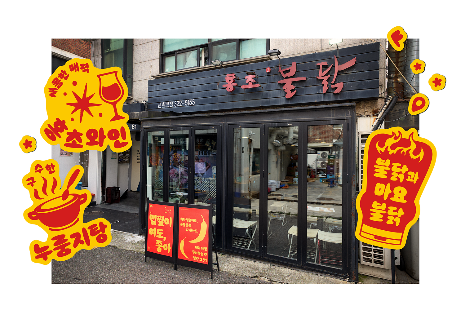 다음으로 살펴볼 메뉴는 무려 불닭입니다. 사람들이 치맥을 즐길 때, 신촌에서는 불홍 조합을 맛볼 수 있다는 사실, 알고 계셨나요? 불맛 가득 머금은 불닭에 한 잔 곁들이고 싶다면 <홍초불닭>에서는 맥주 대신 홍초 와인을 추천합니다. 홍초에 소주를 섞어 직접 제조하면 되는데, 매콤한 불닭과 궁합이 아주 훌륭하답니다. 매운 걸 잘 못 먹는 맵찔이라면 사이드 메뉴를 적극 활용해보세요. 클래식한 주먹밥과 계란찜은 물론 어묵탕, 누룽지탕까지. 불닭 더 맛있게 먹는 법 연구하러 온 단골들로 오늘도 <홍초불닭>이 북적입니다.