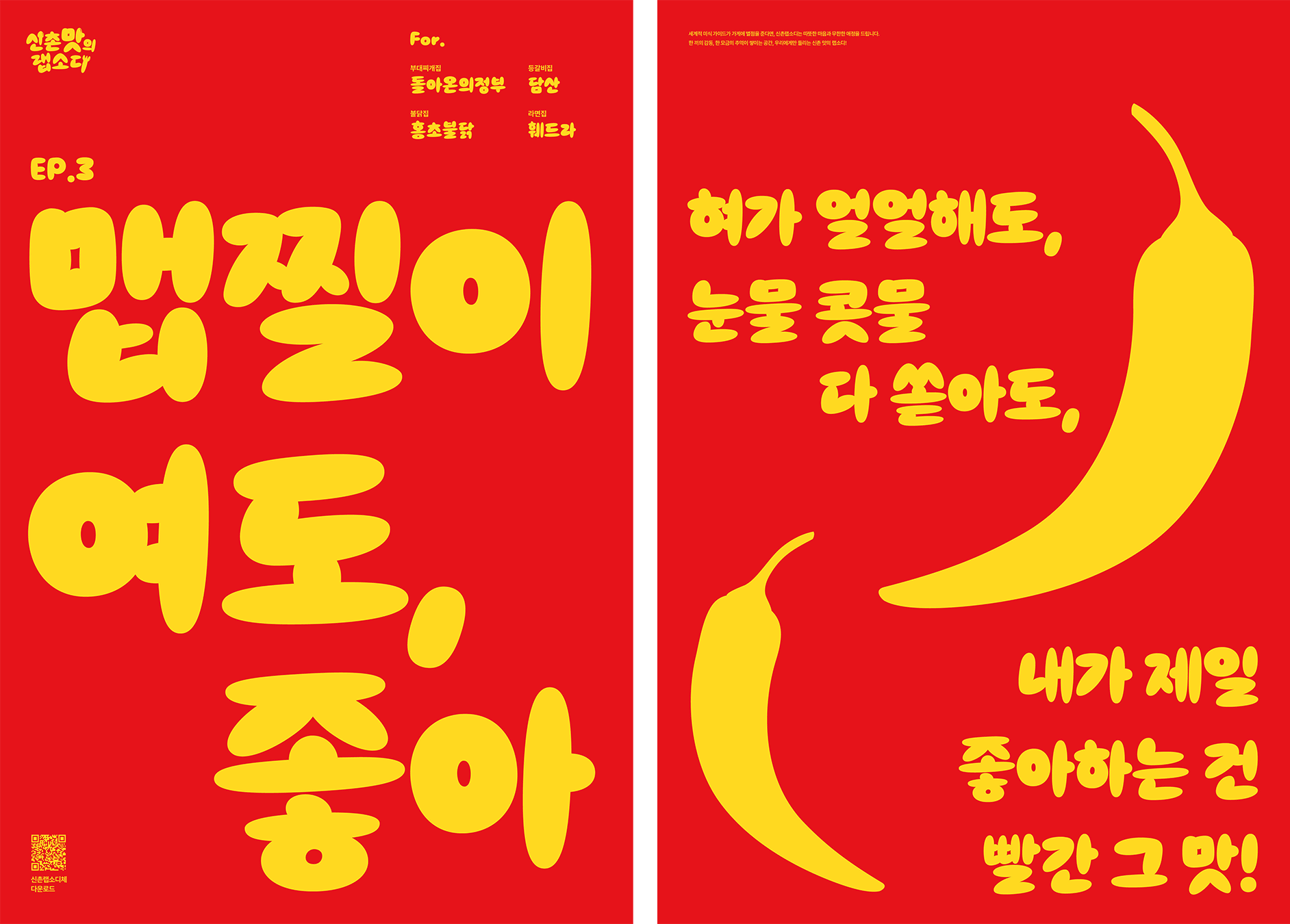지금, 신촌의 여름은 무척이나 시원합니다. 이 무더위에 무슨 뚱딴지같은 말이냐고요? 땀이 쑥 빠질 만큼 매콤한 맛, 바삭바삭한 튀김 옷과 시원한 탄산감의 조화, 밤의 허기를 달래주는 쫄깃한 식감. 한 입이면 더위와 스트레스를 날려버리는 음식들이 하루 내내 여러분을 기다리고 있기 때문이죠. 폭염의 나날, 이열치열의 이치를 깨닫게 하는 매운맛과 야식의 유혹을 느끼러 신촌랩소디 상권으로 다시 떠나볼까요?
